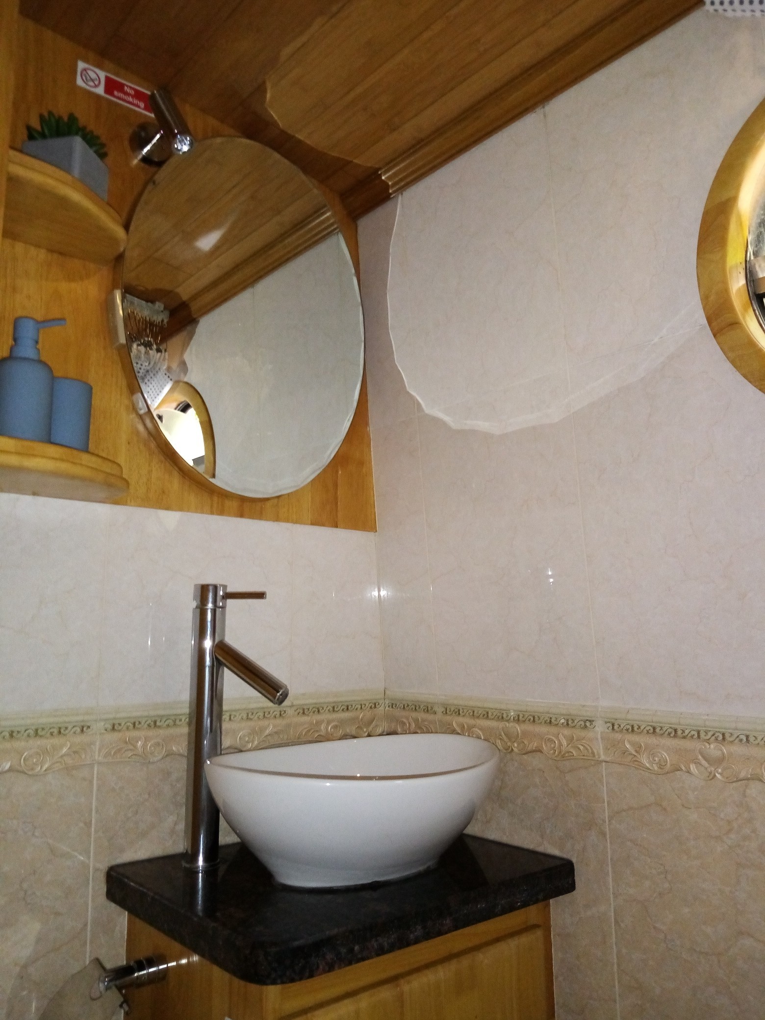 * a fitted shower, toilet and hand-basin room, with granite flooring.